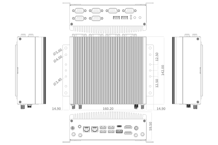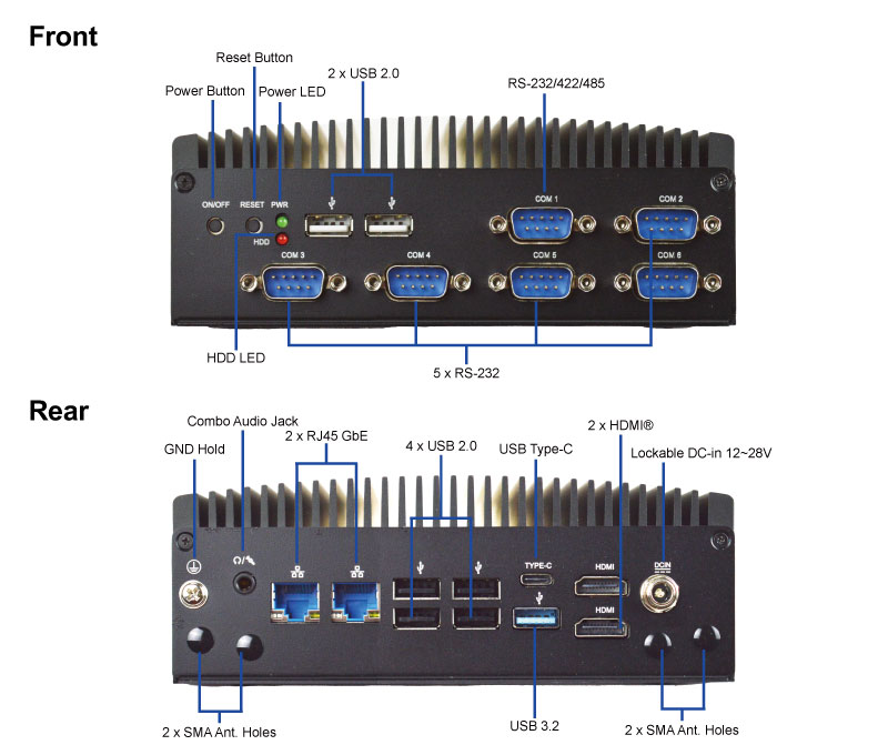 | REAR PANEL I/O | 4 x USB 2.0 1 x USB 3.2 Gen 2x1 Type-C (10Gbps) Support DP ALT Mode 1 x USB 3.2 Gen 2x1 (10Gbps, Formerly USB 3.1 Gen 2) 2 x HDMI® 1 x DC-in (Lockable) 2 x RJ45 4 x Antenna Holes 1 x Audio ( Line out, MIC) 1 x GND Hold |