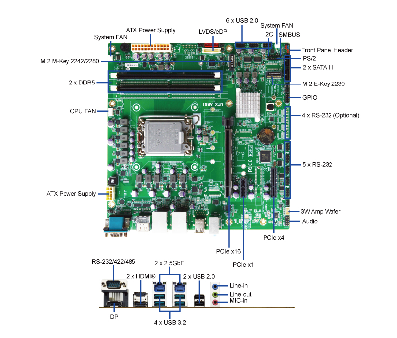 • Additional Expansion: 1 x M.2 E-Key, 1 x PCIe Gen 5 x16, 1 x PCIe Gen 4 x4, 1 x PCIe Gen 4 x1
